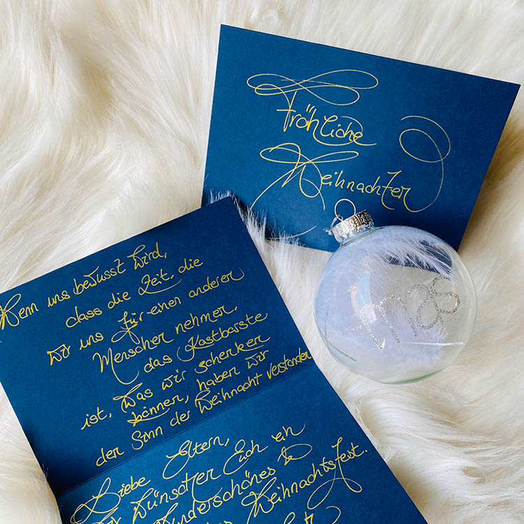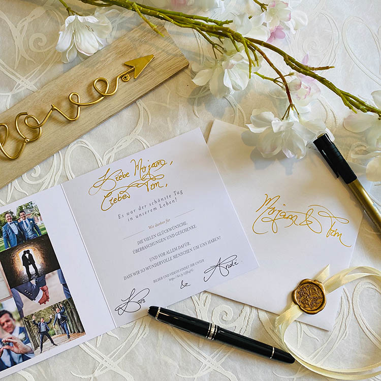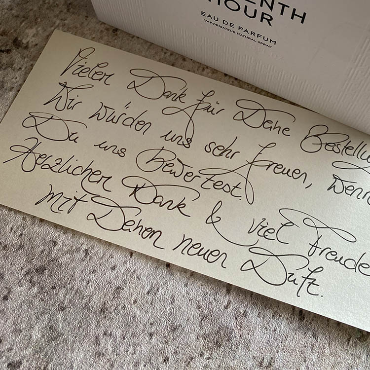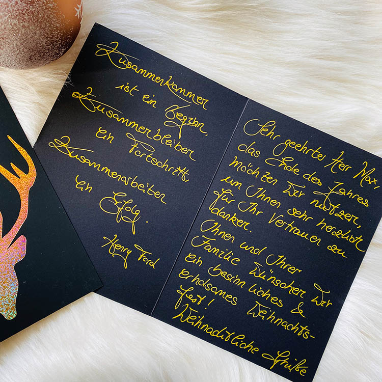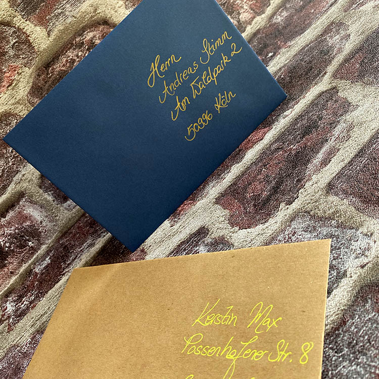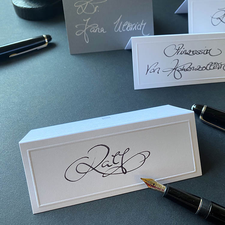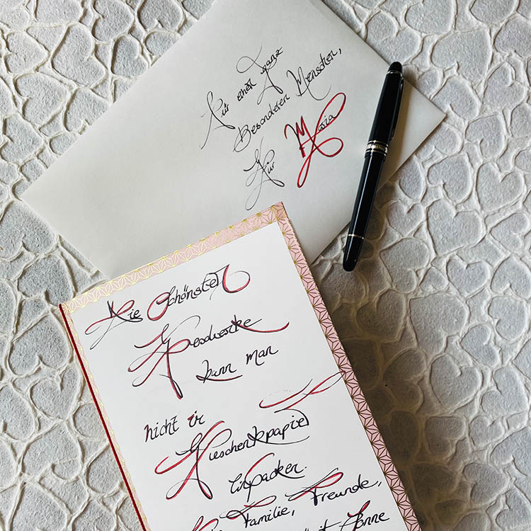 Für UnternehmenProfitieren Sie vom Wow-Effekt handschriftlicher Kommunikation und einer Öffnungsquote von über 99%Wenn es um Handgeschriebenes geht, dreht sich alles um Sie. Ich gestalte für Sie und Ihr Unternehmen handschriftliche Kommunikation – personalisierte Einladungen, Briefe, Paketbeileger, Tischkarten, Glückwunschkarten, uvm. Setzen Sie ein Statement mit einer schönen Handschrift. |