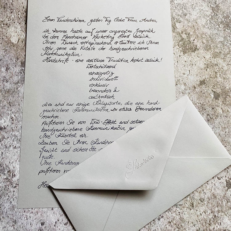 Wertschätzend, einzigartig, individuell, exklusiv, besonders und authentisch – dies sind nur einige Schlagworte, die eine handgeschriebene Kommunikation zu etwas Besonderem machen. Mit Handschrift drücken Sie Ästhetik, Exklusivität und Nachhaltigkeit aus.